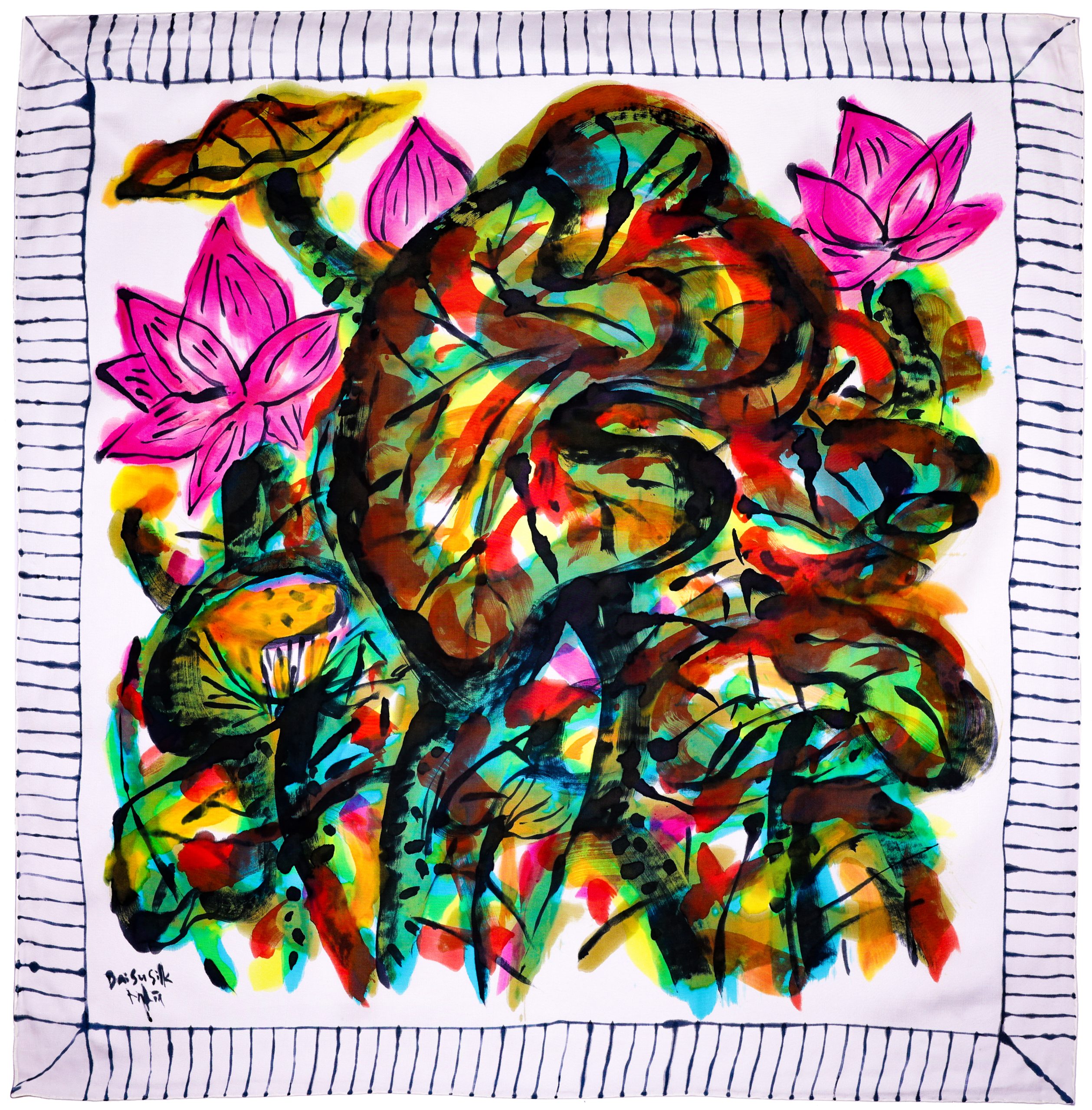 “Ngay tại xưởng chế tác, sau khi vải tơ tằm dệt xong, trải qua các công đoạn kiểm định, nấu chuội làm mềm, khăn sẽ được chuyển sang vẽ tay với những bí kíp màu độc quyền và duy nhất tại Việt nam…”