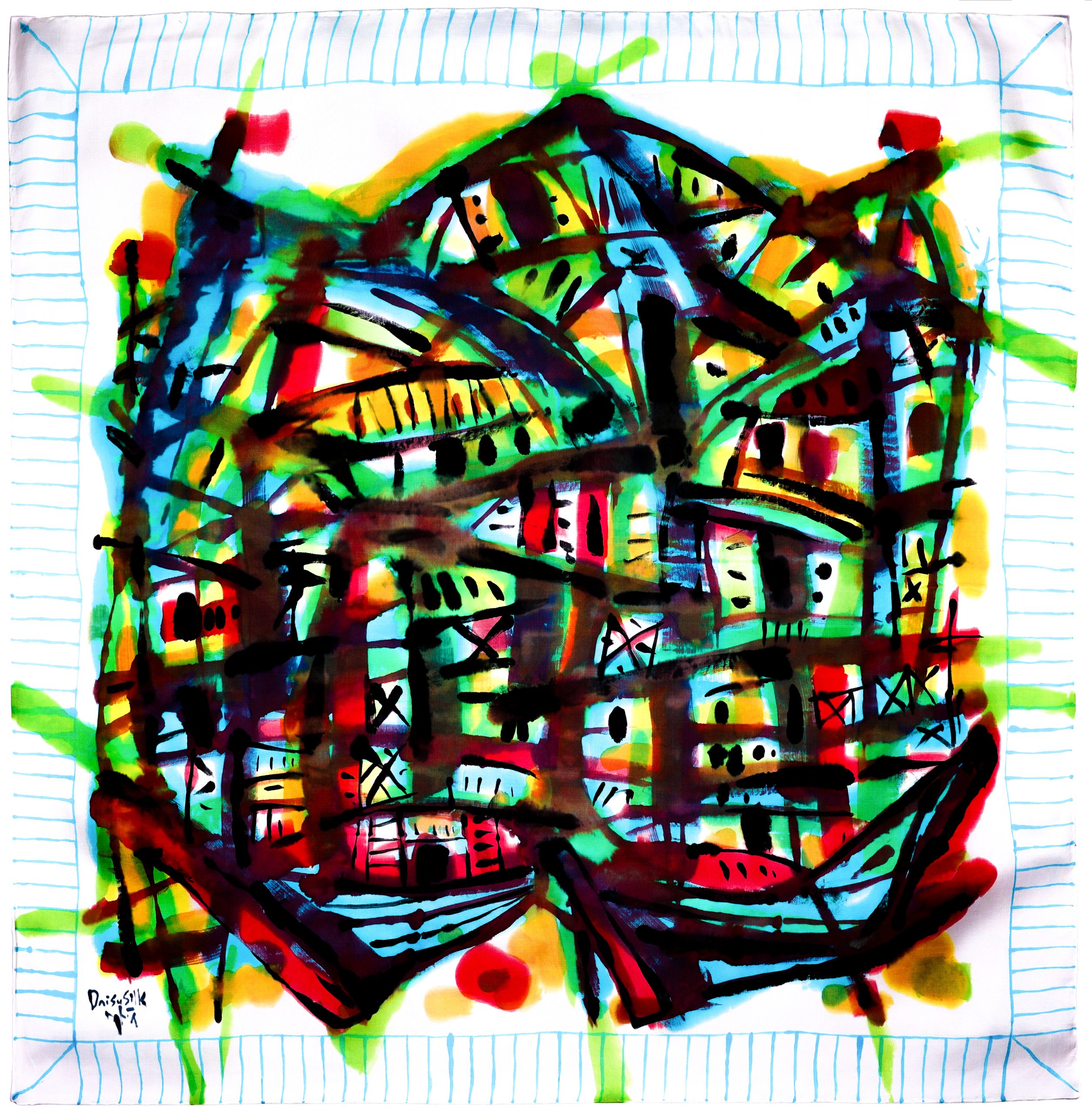 “Ngay tại xưởng chế tác, sau khi vải tơ tằm dệt xong, trải qua các công đoạn kiểm định, nấu chuội làm mềm, khăn sẽ được chuyển sang vẽ tay với những bí kíp màu độc quyền và duy nhất tại Việt nam…”