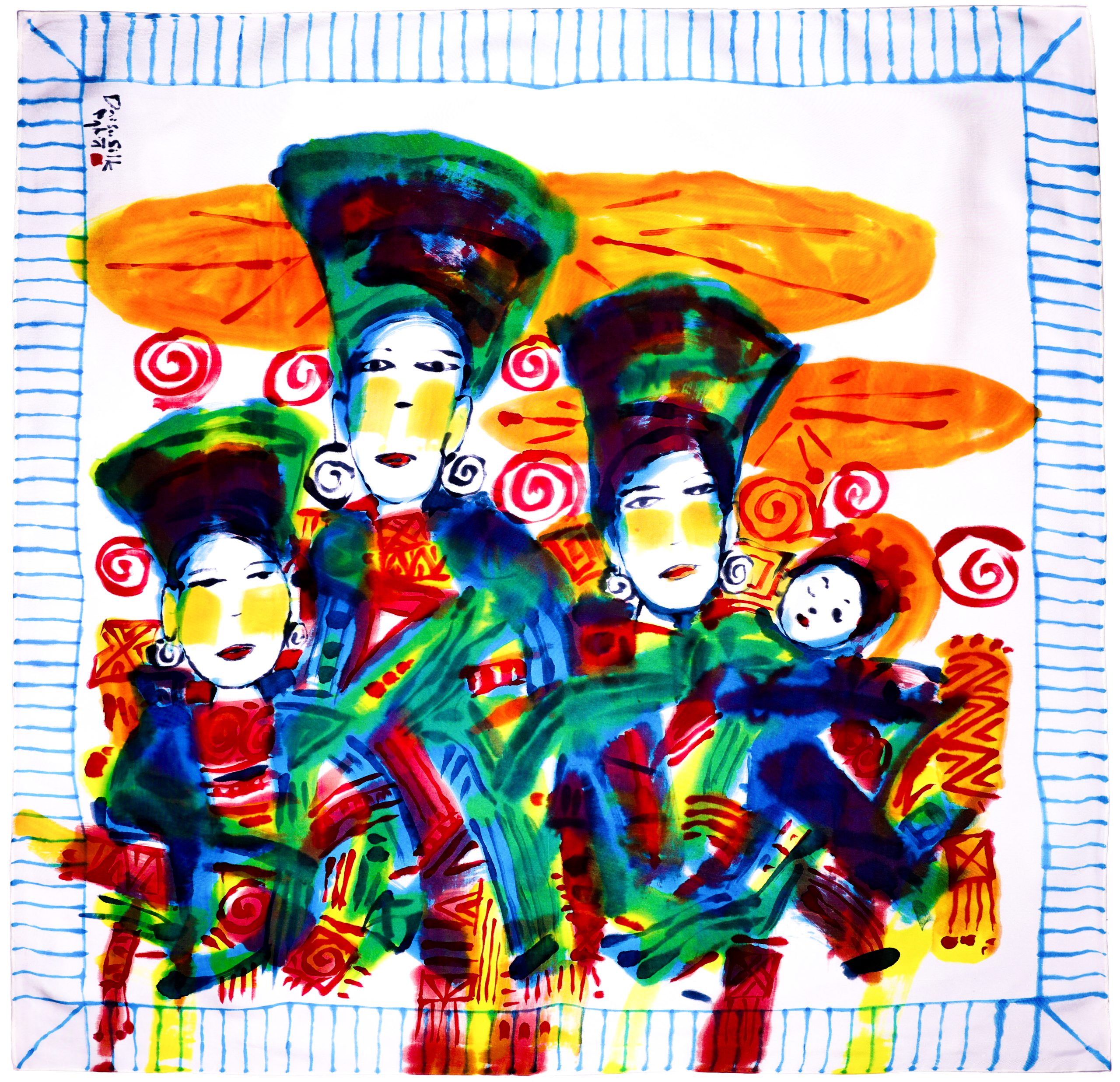 “Ngay tại xưởng chế tác, sau khi vải tơ tằm dệt xong, trải qua các công đoạn kiểm định, nấu chuội làm mềm, khăn sẽ được chuyển sang vẽ tay với những bí kíp màu độc quyền và duy nhất tại Việt nam…”