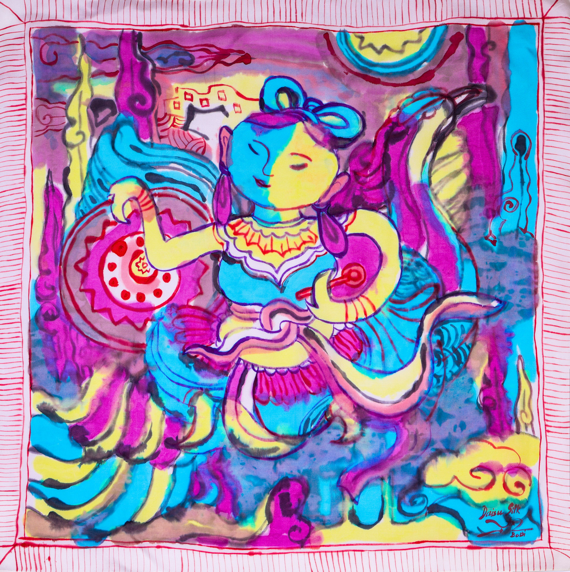 “Ngay tại xưởng chế tác, sau khi vải tơ tằm dệt xong, trải qua các công đoạn kiểm định, nấu chuội làm mềm, khăn sẽ được chuyển sang vẽ tay với những bí kíp màu độc quyền và duy nhất tại Việt nam…”