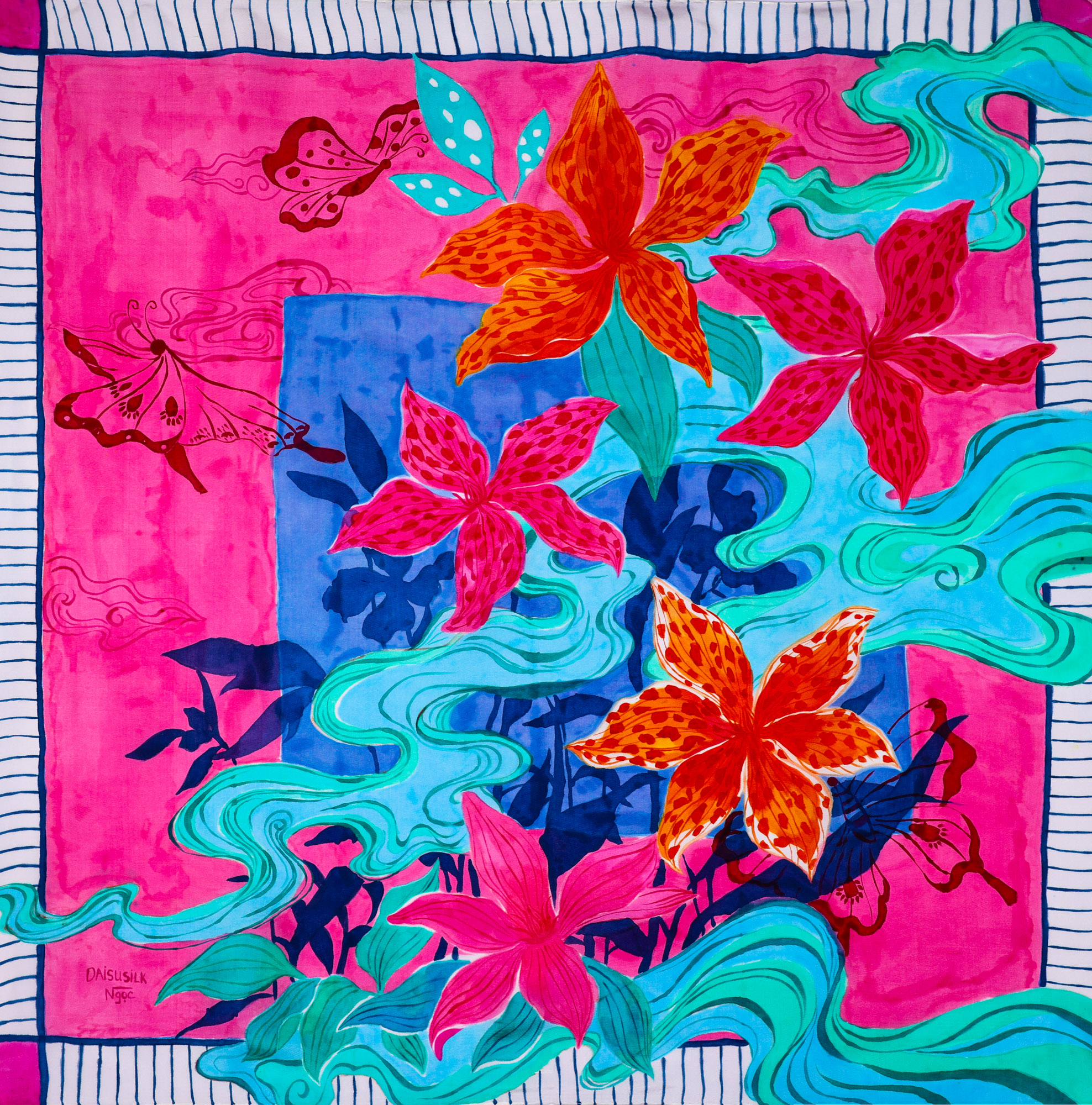 Daisu Silk sets very high standards in selecting quality of silk yarn and strict requirements for in- house craft making processes. Right at the workshop, when the silk fabric is woven, it is sent to a Creative Division to be hand- dyed and hand -painted with exclusive knowhow and techniques. We are not only skillful in silk weaving but also deeply study and understand about color techniques to create trendy and fashionable items.
